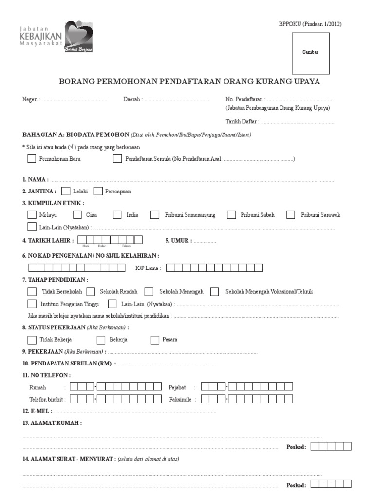 Penggantian Kad tidak memerlukan pengesahan Pegawai Perubatan Pengamal Perubatan Pakar Perubatan. Borang permohonan oku jabatan kebajikan masyarakat. Berikut adalah maklumat berkaitan kategori OKU jenis panduan menggunakan borang dan syarat-syarat pendaftaran serta manfaat yang layak diterima oleh OKU yang berdaftar.