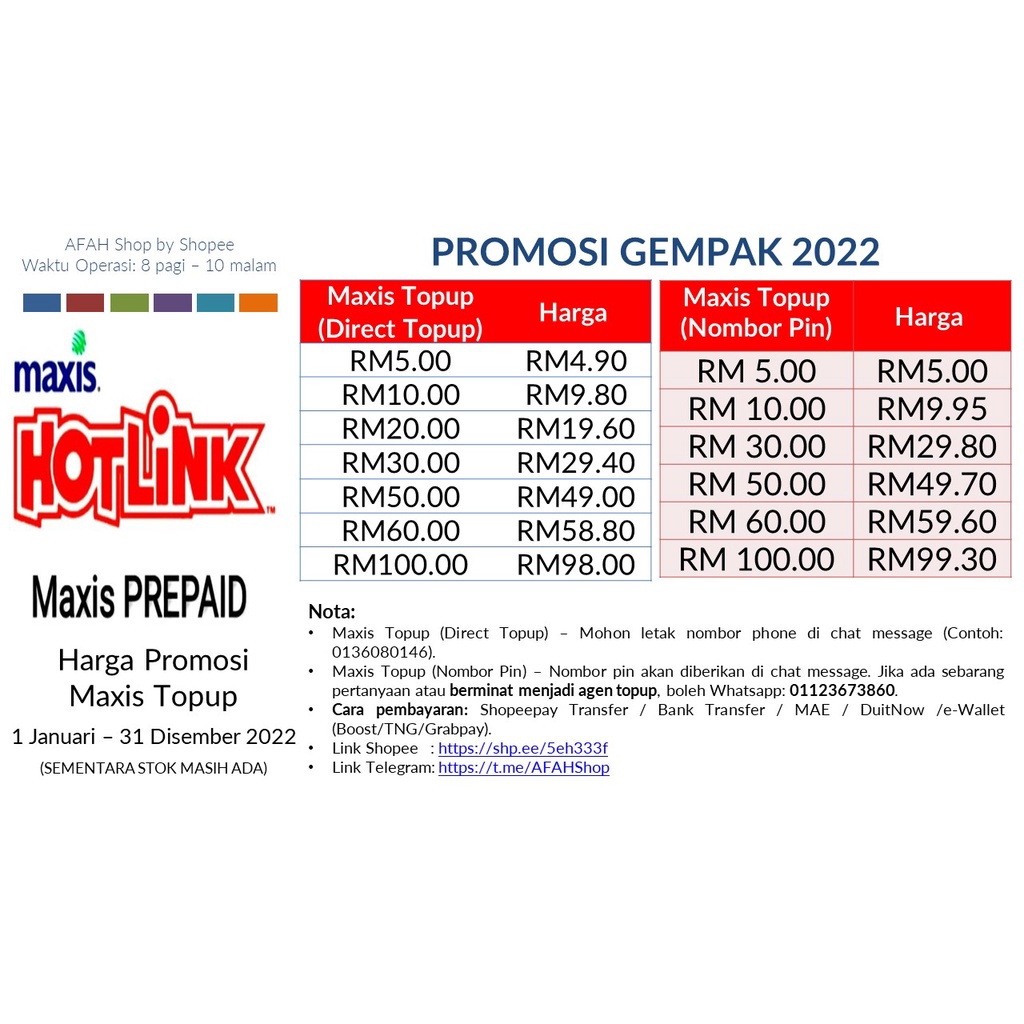 Maxis Hotlink Prepaid Direct Topup Dan Pin Topup Harga Rm30 Rm50 Rm60 Rm100 Shopee Malaysia